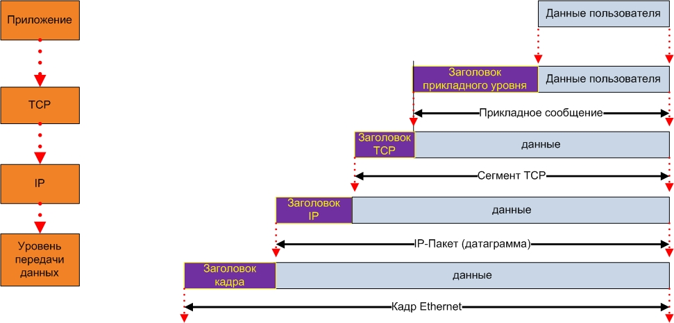 В процессе обработки данных каждый протокол вкладывает или «инкапсулирует» данные в форму пригодную для передачи соседнему уровню (читай протоколу).